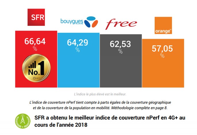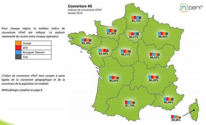 Réalisé à partir de 2 milliards de mesures effectuées depuis 143 370 appareils et sur 365 jours, il désigne Bouygues Télécom comme numéro un en termes de couverture 4G, avec 90,5 % de la population couverte. SFR, Orange et Free suivent avec 89,97 %, 88,28 % et 79,09 %. Comme l’indique la méthodologie, l’indice obtenu correspond à une moyenne de l’indice de couverture géographique et de l’indice de couverture de la population.