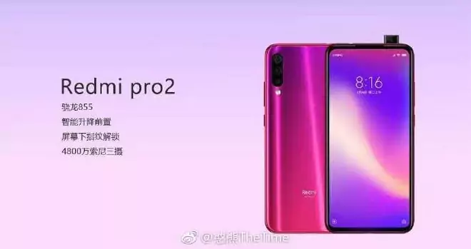 Un visuel marketing relayé sur le réseau social chinois Weibo vient d’ailleurs appuyer cette idée. Le texte évoque en effet un Redmi Pro 2 qui embarquerait le Snapdragon 855, dernier chipset mobile haut de gamme de Qualcomm. Il mentionne aussi un capteur photo 48 Mégapixels, qui a de grandes chances d’être le modèle IMX586 de Sony, sachant que le Redmi Note 7 Pro de milieu de gamme en profite. En regardant l’appareil, ensuite, on dénombre aussi trois capteurs photo dorsaux et remarque un capteur photo frontal au format périscope qui permet d’éviter l’encoche. On constate aussi l’absence d’un lecteur d’empreintes, ce qui suggère une intégration dans l’écran.