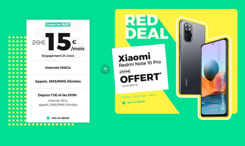 Jusqu’au 18 juillet 2021, la marque Red by SFR commercialise un forfait mobile 4G à 15 euros par mois incluant un smartphone offert en contrepartie d’un engagement de 24 mois. Il s’agit d’ailleurs d’un Xiaomi Redmi Note 10 Pro avec 128 Go de stockage d’une valeur de 299 euros.