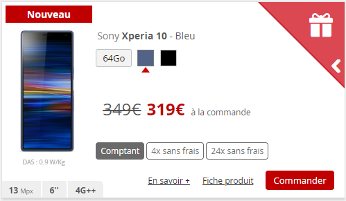 Sony Xperia 10 : Le tarif passe de 349 à 319 € soit une remise de 30€. Cette réduction est également valable sur le paiement en plusieurs fois sans frais : en 4 fois 82€ puis 79€ durant 3 mois ou en 24 mensualités :127€ puis 8€ durant 24 mois
