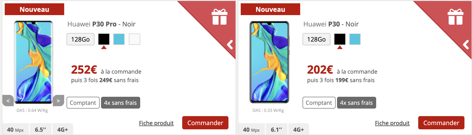 Le Huawei P30 Pro est proposé dans la boutique Free Mobile à 999€ en paiement comptant ou en 4 fois sans frais : 252€ à la commande puis 249€ durant 3 mois.
