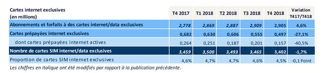 On apprend enfin qu’au cours du quatrième trimestre 2018, 6 cartes SIM sur 10, soit 47,7 millions, ont fonctionné sur un réseau mobile 4G. La proportion atteint plus précisément les 63 %, en progression de 7 points sur un an. Notez d’ailleurs que seules les personnes ayant un forfait et un terminal compatible 4G sont comptabilisées.