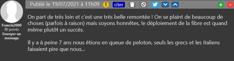 Selon le réseau européen de journalisme de données (EDJNet), les débits moyens sur le fixe avoisinent actuellement les 140 Mbits/s grâce à la démocratisation de la fibre, plaçant ainsi les Français en seconde position en Europe derrière les Danois et devant les Espagnols. Et comme le rappelle Francis2000, ce n’était pas toujours le cas !