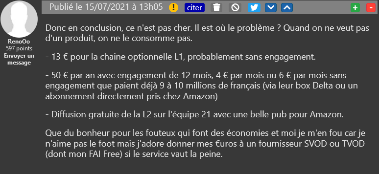 D’autant qu’Amazon Prime propose bien des services supplémentaires, au delà de la plateforme de SVOD disponible sur toutes les Freebox. Et d’ailleurs, certains s’en retrouvent assez heureux que la Ligue 1 soit bel et bien une option.