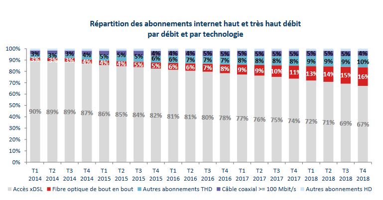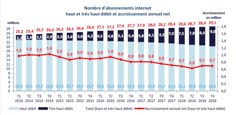 L’ARCEP a publié son observatoire des marchés des communications électroniques en France pour le quatrième trimestre 2018.