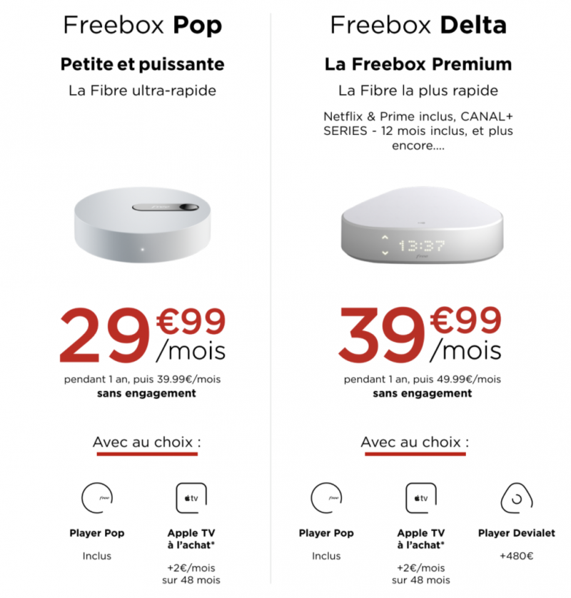 Proposée à la souscription d’un abonnement Pop ou Delta, le décodeur 4K et compatible Dolby Atmos de la firme de Cupertino est disponible à l’achat via un étalement du paiement sur 48 mois à hauteur de 2€/mois, soit un total de 96€. De quoi faire d’importantes économies (-50%) puisque l’Apple TV est affichée sur le site de la marque à la pomme à 199€ en version 32 Go. Le paiement total est également possible à tout moment.