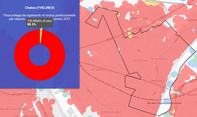 Grâce à la première carte on peut voir que la ville de Chatou est couverte à 98.3% par le très haut débit.