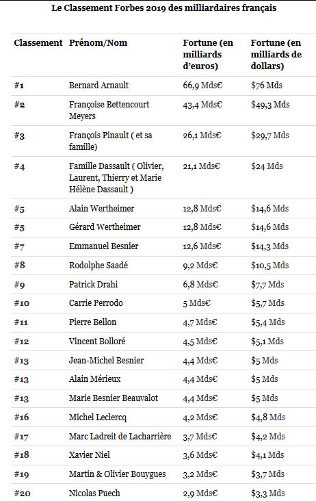 Le top 3 reste inchangé avec Bernard Arnault (LVMH) qui voit sa fortune augmenter de 3.8 milliards de dollars par rapport à l’année dernière (72.2 milliards) et reste à la première place en France tout en conservant sa place de 4ème fortune mondiale. L’héritière du groupe L’Oréal, Françoise Bettencourt Meyers, est revenue à sa place de femme la plus riche du monde avec une hausse de sa fortune qui est dorénavant estimée à 49.3 milliards de dollars (contre 42.2 en 2018) et est désormais la 15ème fortune mondiale.