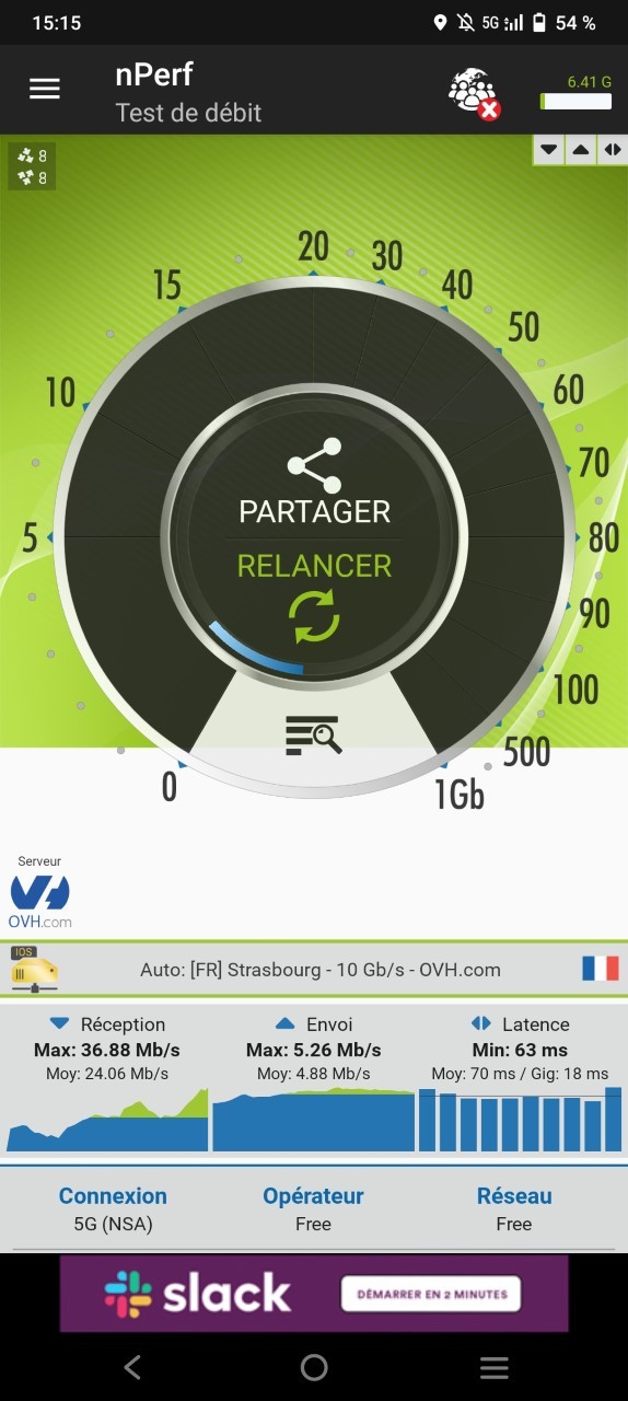 L’outil Disk Speed indique de son côté des débits de 217 Mo/s en écriture et 456 Mo/s en lecture, ce qui n’est pas mal et permet des temps d’installation raisonnables. Comme indiqué plus haut, cette mémoire interne peut être étendue par carte MicroSD, en sacrifiant toutefois la gestion dual-SIM.