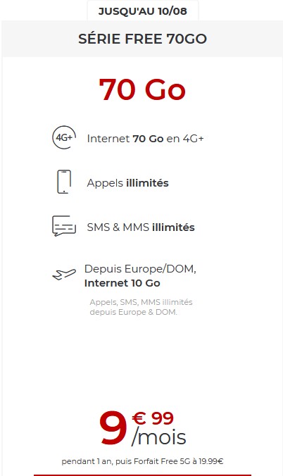 À titre de comparaison, Sosh propose des forfaits 50 et 100 Go à 12,99 et 15,99 euros par mois, Bouygues Telecom des forfaits 60, 100 et 130 Go à 12,99, 14,99 et 19,99 euros par mois. Quant à Red by SFR, il propose des formules 70 Go à 13 euros, 100 Go à 15 euros et 130 Go à 19 euros.