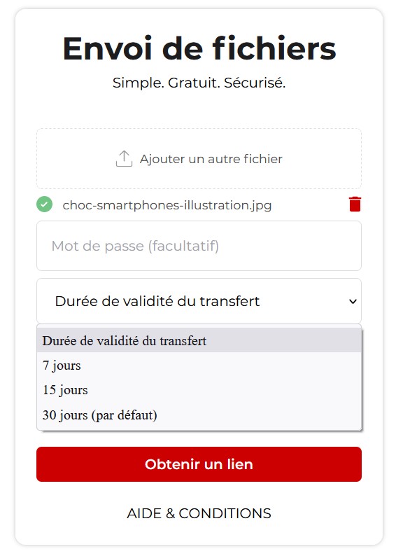 Dans le cas d’un e-mail, vous pourrez ajouter un message personnalisé, tandis que dans la génération du lien vous pourrez définir une durée de validité (7, 15 ou 30 jours). Une sécurisation par mot de passe est aussi au programme.