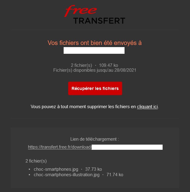Ci-dessous, les e-mails reçus par le destinataire et l’expéditeur après l’envoi de deux fichiers :