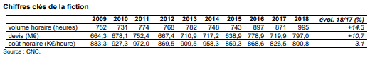 La fiction française au top de sa forme avec 995 heures de production produite en 2018, une augmentation de 14,3 % par rapport a 2017 qui comptabilisaient 871 heures de productions selon un rapport du CNC publié le 11 avril. Le volume de fiction a atteint son plus haut niveau depuis 1996. Les feuilletons quotidiens prennent de plus en plus de place dans l’ensemble des programmes audiovisuels notamment grâce à « Demain nous appartient » sur TF1 et « Un si grand soleil » sur France 2, ce qui permet d’atteindre 21,1 % de fiction.