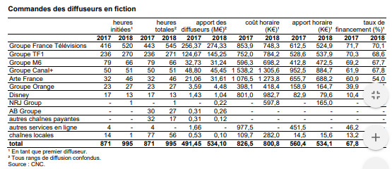 L’investissement est par la force des choses également en hausse de 10,7 % pour atteindre 797 millions d’euros en 2018 contre 719,9 millions en 2017. Le groupe France Télévision reste leader dans le financement de fiction française (274,33 millions) juste devant le groupe TF1 (145,25 millions), suivi de loin par canal + (45,45 millions), Arte France (31,61 millions) et le groupe M6 (31,24 millions) se talonnent, a noter que Arte France n’avait investit que 21,06 millions d’euros en 2017 contre 32,73 millions d’euros pour le groupe M6, ce qui lui permet de passer devant la filiale de RTL Group.