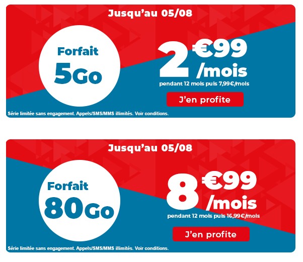 Jusqu’au 5 août 2021, Auchan Telecom propose des forfaits mobiles 4G avec 5 et 80 Go de data (débit réduit au-delà), à respectivement 2,99 et 8,99 euros par mois. Sans engagement, ces séries limitées incluent par ailleurs les appels, SMS et MMS illimités. Le roaming depuis l’UE et les DOM est prévu avec une enveloppe de 5G pour le forfait 5 Go et de 11 Go pour le forfait 80 Go.