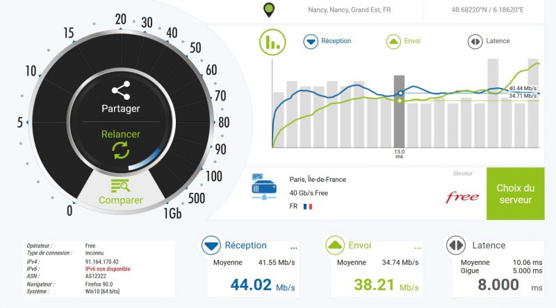 En fibre optique, l’expérience est évidemment totalement différente. Si n’avions pas la configuration optimale (la meilleure Freebox, le meilleur ordinateur et la connexion en filaire), nous avions tout de même une moyenne de 41,55 Mbit/s en réception et de 34,74 Mbit/s en émission.