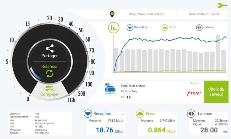En ADSL, l’expérience n’est évidemment pas la plus optimale. Et pourtant, nous n’avions pas les pires débits, avec une moyenne de 17,82 Mbit/s en réception/téléchargement et 0,74 Mbit/s en émission/’envoi, d’après l’outil nPerf.