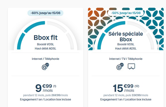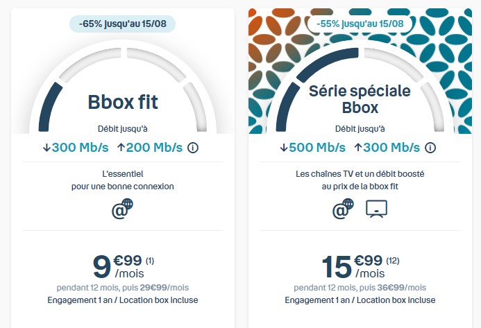 Jusqu’au 15 août 2021, l’offre Bbox Fit est à 9,99 euros par mois pendant 12 mois, avant de passer à 29,99 euros par mois, pendant qu’une offre Série spéciale Bbox est proposée à 15,99 euros par mois pendant 12 mois, avant de passer à 36,99 euros par mois.