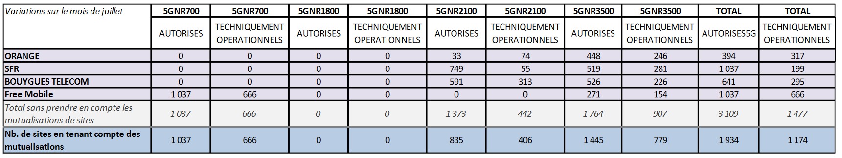 1 457 sites 5G de Free fonctionnent sur la bande 3,5 GHz, dite bande cœur, qui laisse envisager de meilleurs débits. L’opérateur a activé 154 sites sur cette fréquence en juillet. C’est moins que SFR (281), Orange (246) et Bouygues (226).