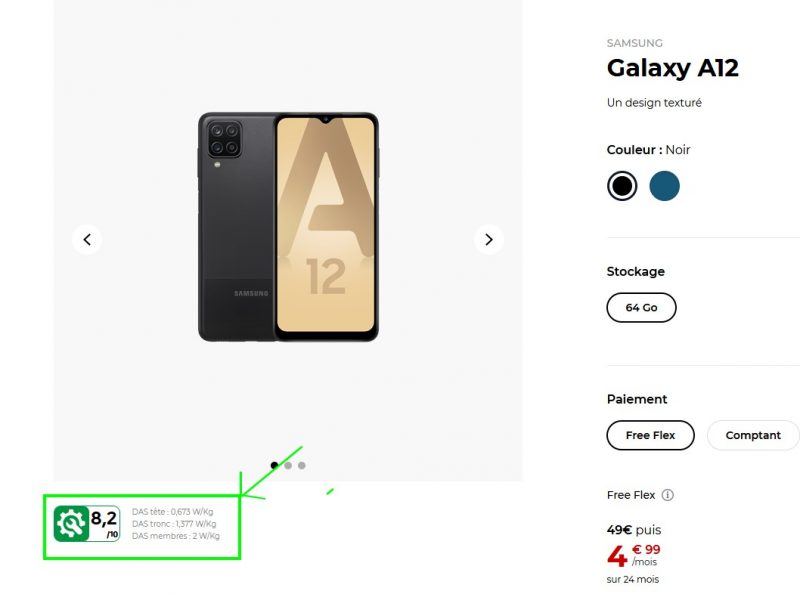 Puis un exemple avec le Samsung Galaxy A12 dont les DAS tête, tronc et membres atteignent respectivement 0,673, 1,377 et 2 W/kg. La note de réparabilité s’affiche cette fois-ci à 8,2/10.
