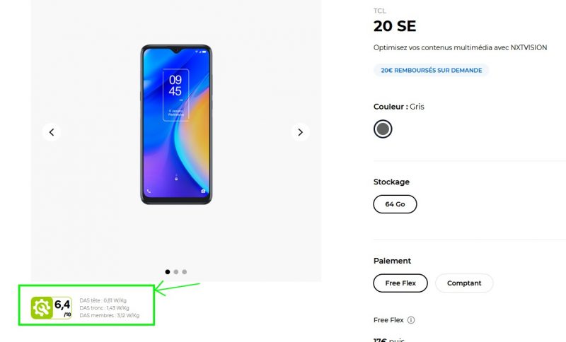 Pas besoin de chercher bien loin puisque ces deux données se retrouvent au même endroit, juste en dessous des visuels. Ci-dessus, un exemple avec le TCL 20 SE, dont les DAS tête, tronc et membres atteignent respectivement 0,81, 1,43 et 3,12 W/kg, soit en dessous des 2, 2 et 4 W/kg en vigueur.