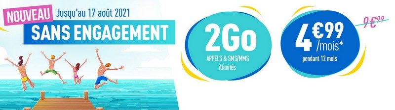 Un forfait 2 Go revient à 4,99 euros par mois, puis 9,99 euros au-delà des 12 premiers mois. Il propose les appels, SMS et MMS en illimité depuis la France métropolitaine, l’UE et les DOM/COM. Pour la data mobile, celui-ci comprend une enveloppe de 2 Go utilisable en France métropolitaine, comme en roaming (0,01 euro/Mo au-delà).