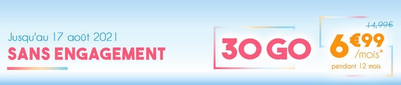 Un forfait 30 Go coûte quant à lui 6,99 euros par mois, avant de passer à 14,99 euros. On a les appels, SMS et MMS illimités depuis la France métropolitaine, l’UE et les DOM/COM. L’enveloppe data 4G/4G+ est de 30 Go (0,01 euro/Mo au-delà), dont 9 Go disponibles en roaming.