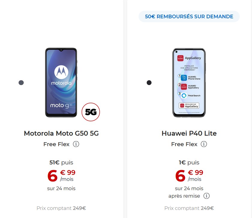 Aujourd’hui, nous opposons les Motorola Moto G50 5G et Huawei P40 Lite, tous les deux affichés à 249 euros. Notez d’ailleurs qu’ils sont disponibles au comptant ou via la nouvelle offre Free Flex.