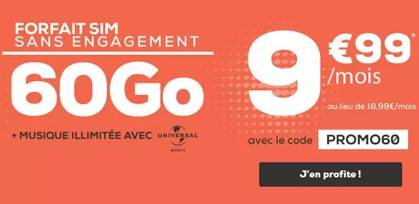 Le forfait comprend appels, Sms et MMS illimités et 60 Go de data en 4G (bloqué puis rechargeable) en France. Il sera également utilisable en Europe et dans les DOM puisqu’une enveloppe data de 10Go est proposée avec appels/SMS/MMS illimités. Le forfait propose également l’accès illimité au catalogue d’Universal Music. Pour bénéficier de cette offre qui se terminera le 22 avril 2019, il faudra utiliser le code promo PROMO60. La carte SIM triple découpe est facturée 9,90€. La Poste Mobile opère sur le réseau de SFR.