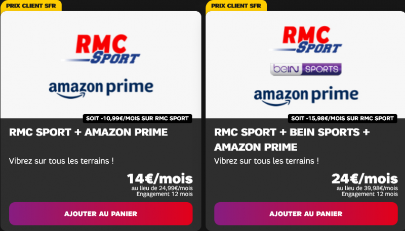 Les abonnés SFR peuvent également opter pour le pack RMC Sport + beIN SPORTS + Amazon Prime à partir de 24€/mois la première année puis 39.98€/mois. Avec Le Pass Ligue 1 en supplément à 12,99€/mois sur Prime Video, ils profitent ainsi pour 36,99€/mois la première année d’une offre encore plus complète avec notamment 100% de l’UEFA Champions League.