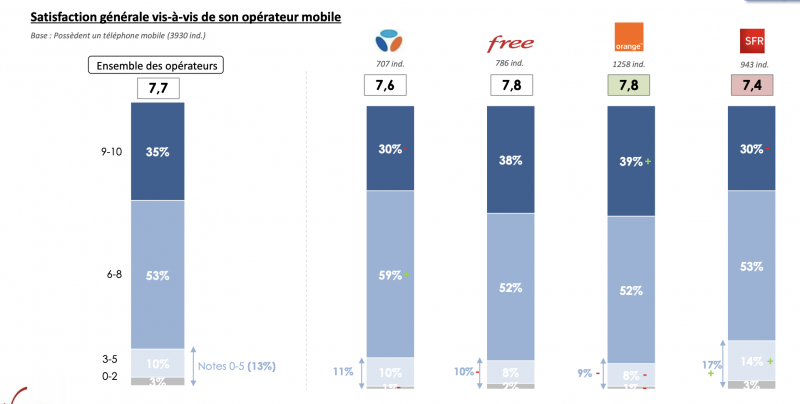 Premier enseignement, “la satisfaction globale vis-à-vis des opérateurs mobiles est plus importante (notés 7,7 en moyenne) que vis-à-vis des fournisseurs d’accès à internet, notés 7,3 en moyenne, pour une connexion fixe.” D’un point de vue global, services mobiles et fixes confondus, Orange tire son épingle du jeu avec une note de 7,7. Free le colle aux basques (7,6) devant Bouygues Telecom (7,4). A la dernière place, SFR est à la traîne (7,1).