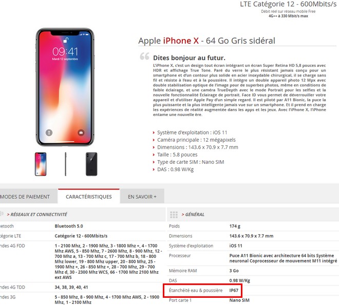 Comme l’indique assez brièvement la boutique de Free Mobile, l’IP (Indice de protection) correspond en effet à la résistance aux infiltrations de poussière et d’eau. Dans le détail, le premier chiffre correspond aux infiltrations de corps solides, tandis que le second est lié aux infiltrations de liquide.