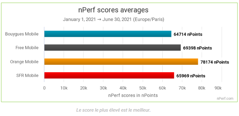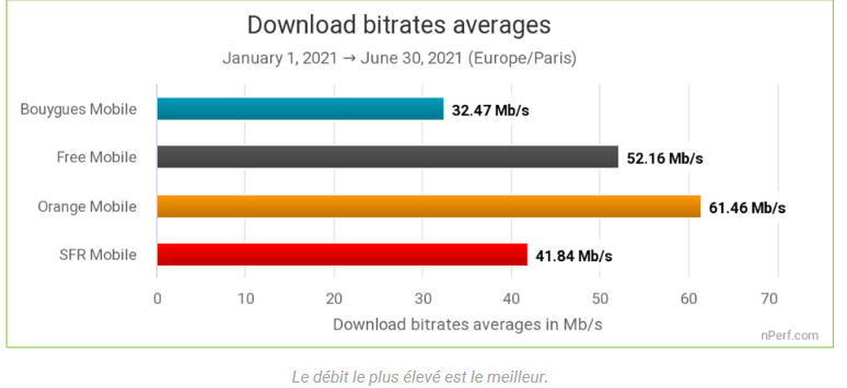 L’opérateur de Xavier Niel était déjà parvenu à se hisser sur la deuxième marche du podium derrière l’opérateur historique en 2019 et 2020 et conserve la cadence en ce premier semestre. C’est notamment sur les débits descendants que Free se démarque de ses autres concurrents, proposant un débit moyen en 4G de 52.16 Mb/s, contre 61.46 Mb/s pour Orange. Bouygues et SFR sont loin derrière sur ce point, avec respectivement un débit de 32.47 Mb/s et 41.84 Mb/s .