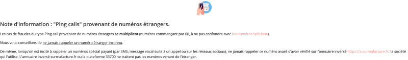 Free, Orange, Bouygues et SFR insistent également sur la récurrence des Ping calls provenant de numéros étrangers avec un numéro commençant par 00. Il convient de rappeler qu’il ne faut jamais rappeler un numéro étranger inconnu.