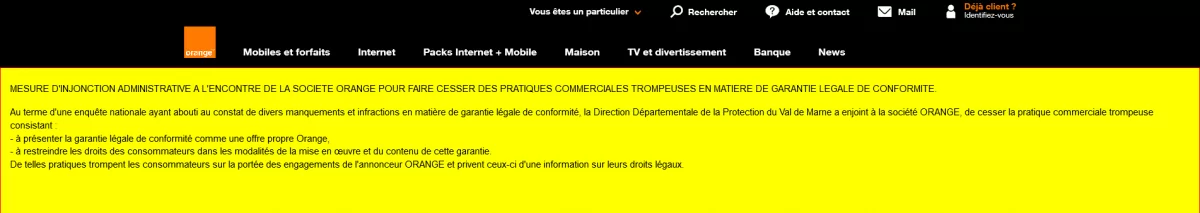 La source du litige provient de la garantie légale de conformité de deux ans, obligatoire depuis 2016, qu’Orange présente bien sur ses étiquettes en boutique et sur son site, mais sans préciser qu’il s’agissait de la garantie était imposée légalement. Il laissait ainsi entendre que cette dernière était offerte par Orange lui même, ce qui a fortement déplu à la DDP. Ainsi, l’opérateur doit donc afficher le message suivant sur sur son site marchand et ce du 12 août au 11 septembre.