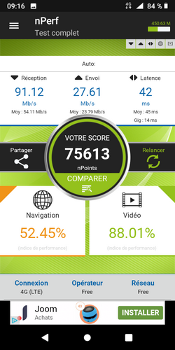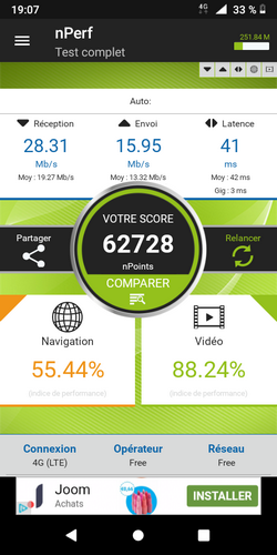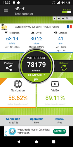 Abordons maintenant la partie surf. Avec une bonne connexion 4G ou Wi-Fi, le surf et le téléchargement ne s’effectuent pas à toute vitesse, mais se passent assez convenablement. Voici d’ailleurs des mesures réalisées avec nPerf pour illustrer les débits 4G obtenus en intérieur et en extérieur. L’accroche réseau s’effectue dans un délai convenable.