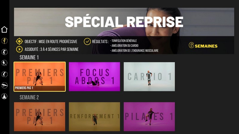 Concernant les cours, ils peuvent être suivis sous la forme de programmes en sélectionnant les différentes sections. Tout le monde devrait y trouver son bonheur, aussi bien ceux reprenant le sport après avoir larvé pendant les vacances (“Spécial reprise”), ceux ayant quelques kilos à déloger (“Perte de poids”) ou ceux recherchant simplement un petit entretien (“En douceur”). Les plus motivés pourront se tourner vers la section “Challenger” ou “Tonification”. Lors de la sélection, on a accès à l’objectif, à l’assiduité nécessaire et aux résultats.