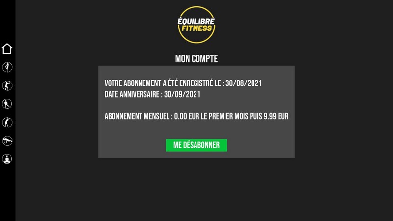 Équilibre-Fitness ne réinvente pas la roue côté interface. On a une barre latérale de navigation et une grille de vignettes donnant accès aux différents contenus.