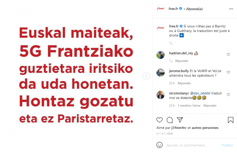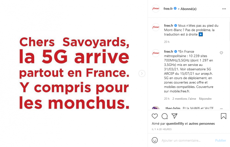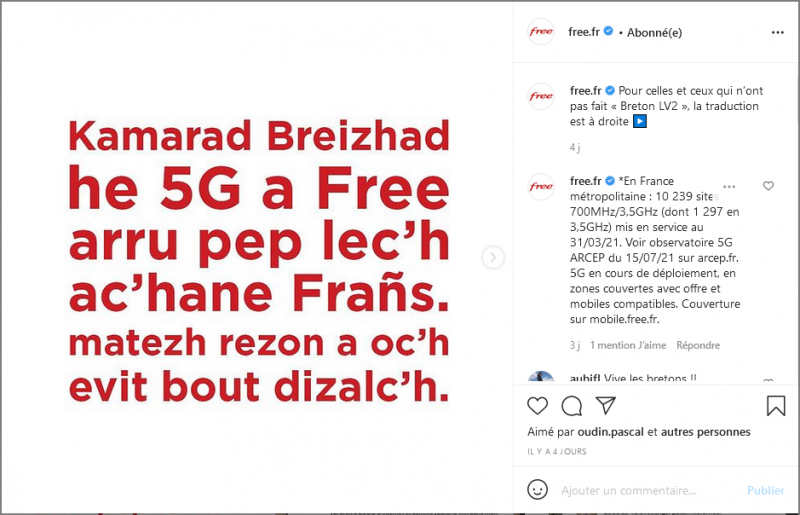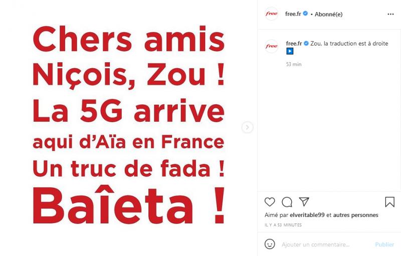 L’opérateur publie en effet régulièrement des posts sur son compte Instagram avec un format très simple : un écriteau rouge sur fond blanc, rappelant la disponibilité de la 5G dans différentes régions de France. Avec une petite particularité : chaque message est rédigé dans une langue locale, ou en utilisant de l’argot. Le tout sans oublier de fournir une deuxième image, traduisant le message pour les non-initiés.