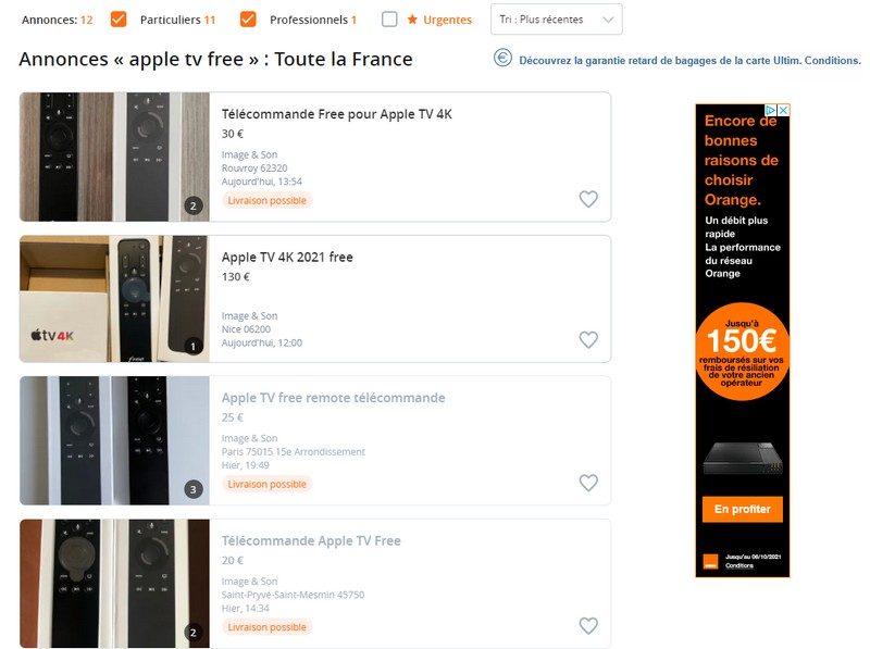 Avec un boîtier Apple TV 4K proposé à l’achat en tant que player optionnel au tarif préférentiel de 96 euros (2 euros par mois pendant 48 mois) et une possibilité de petit bénéfice en cas de revente (c’est 199 euros directement chez Apple), la tentation était plus qu’évidente. Et ça n’a pas manqué. On commence en effet à retrouver l’équipement sur le célèbre site de petites annonces Leboncoin avec la requête “Apple TV Free”.