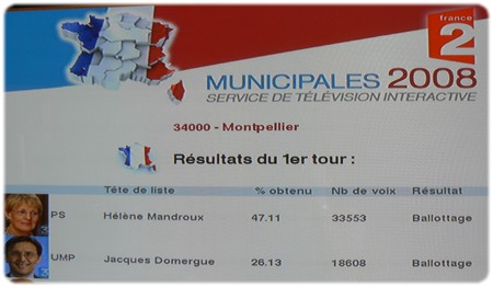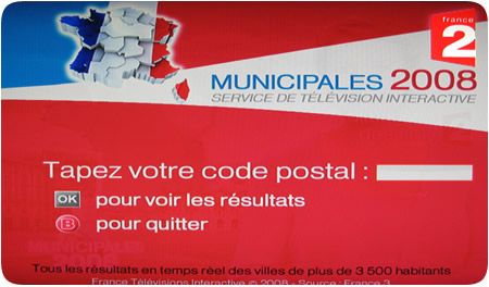 Aujourd’hui, France 2 et France 3 lancent un nouveau service temporaire spéciale "Elections Municipales 2008". Il s’agit d’un service interactif pour les résultats des municipales sur toute la France, en tapant le code postal et on obtient le résultat de sa ville. Ce service est accessible depuis France 2 (canal 2) ou depuis France 3 (canal 3). Vous verrez alors apparaître le bandeau ci-dessous. Il ne vous reste plus qu’à taper sur la touche "info" pour avoir accès au service.