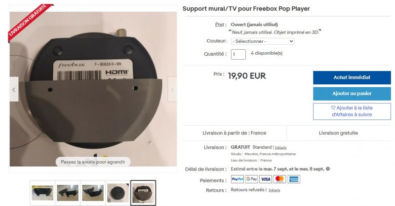 Le modèle dédié au player Freebox Pop revient quant à lui à 19,90 euros et se décline dans des coloris blanc, noir ou argenté. “Il peut être utilisé comme support mural ou pour accrocher le Player derrière la TV (avec du simple ruban bi-adhésif)”, explique au passage le vendeur.