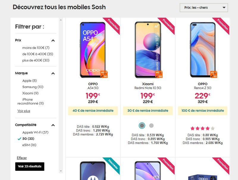 Bien que ne proposant pas de forfaits mobiles 5G, Sosh vend tout de même des smartphones compatibles. Rien de surprenant cela dit, puisque la 5G a fini par ruisseler pour arriver sur l’entrée de gamme. La marque laisse ainsi le choix entre 33 modèles, avec des prix oscillant entre 199 et 1 799 euros.