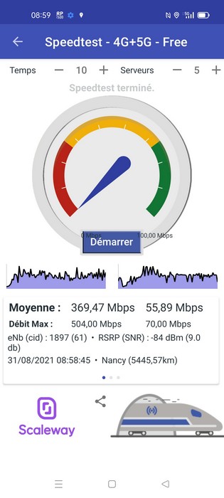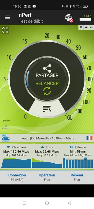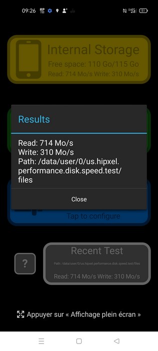 Si les performances s’expliquent par le chipset Snapdragon 765G et les 8 Go de RAM à bord, mais également par l’écran 90 Hz, la réactivité de la mémoire interne en UFS 2.1 apporte sa contribution. L’outil Disk Speed nous indiquait ainsi 714 Mo/s en lecture et 310 Mo/s en écriture. Pas le Go/s proposé par certains, mais suffisamment pour réduire les temps d’installation et de chargement.