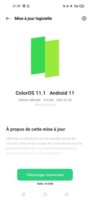 - 1 mise à jour système de 613 Mo (pour installer les correctifs de juillet 2021)