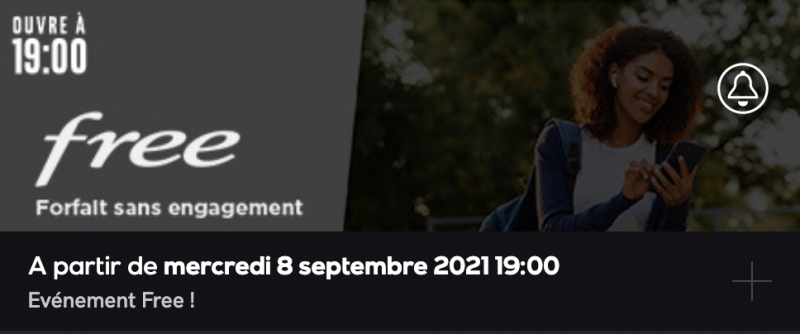 A l’heure où l’abonnement Freebox Révolution à prix mini joue encore les prolongations sur le site d’e-commerce Veepee, une autre offre promotionnelle est dans les starting-blocks. Ce mercredi 8 septembre à 19h, Free Mobile lancera une nouvelle offre et tout porte à croire qu’il s’agira d’une promo inhabituelle en atteste l’image d’illustration de la vente privée. L’opérateur n’offrira pas cette fois-ci un smartphone mais proposera “un forfait sans engagement”. Reste à découvrir à quel point cette vente privée sera attractive.