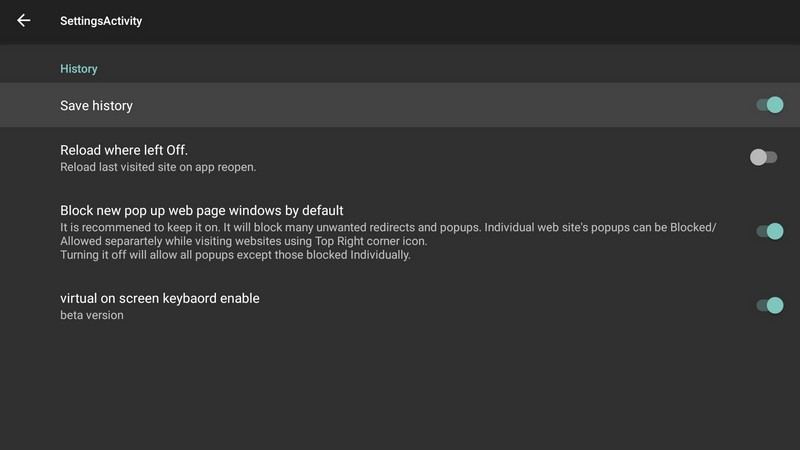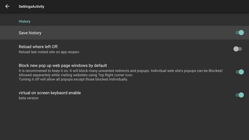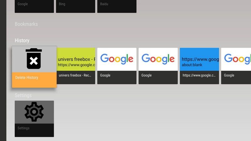 L’aspect vie privée n’a pas été oublié par TV Browser. On peut ainsi supprimer l’historique de navigation depuis l’écran d’accueil.