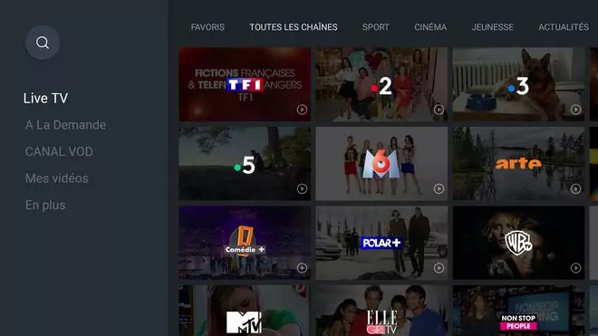 Parlons tout d’abord des différentes sections consacrées aux contenus. Il y a la section Live TV qui permet de regarder la télévision en direct. On peut filtrer les contenus, grâce à la partie supérieure qui suggère une navigation dans les chaines TV favorites ou dans les chaînes d’une thématique en particulier (sport, cinéma, jeunesse, actualités, etc.).