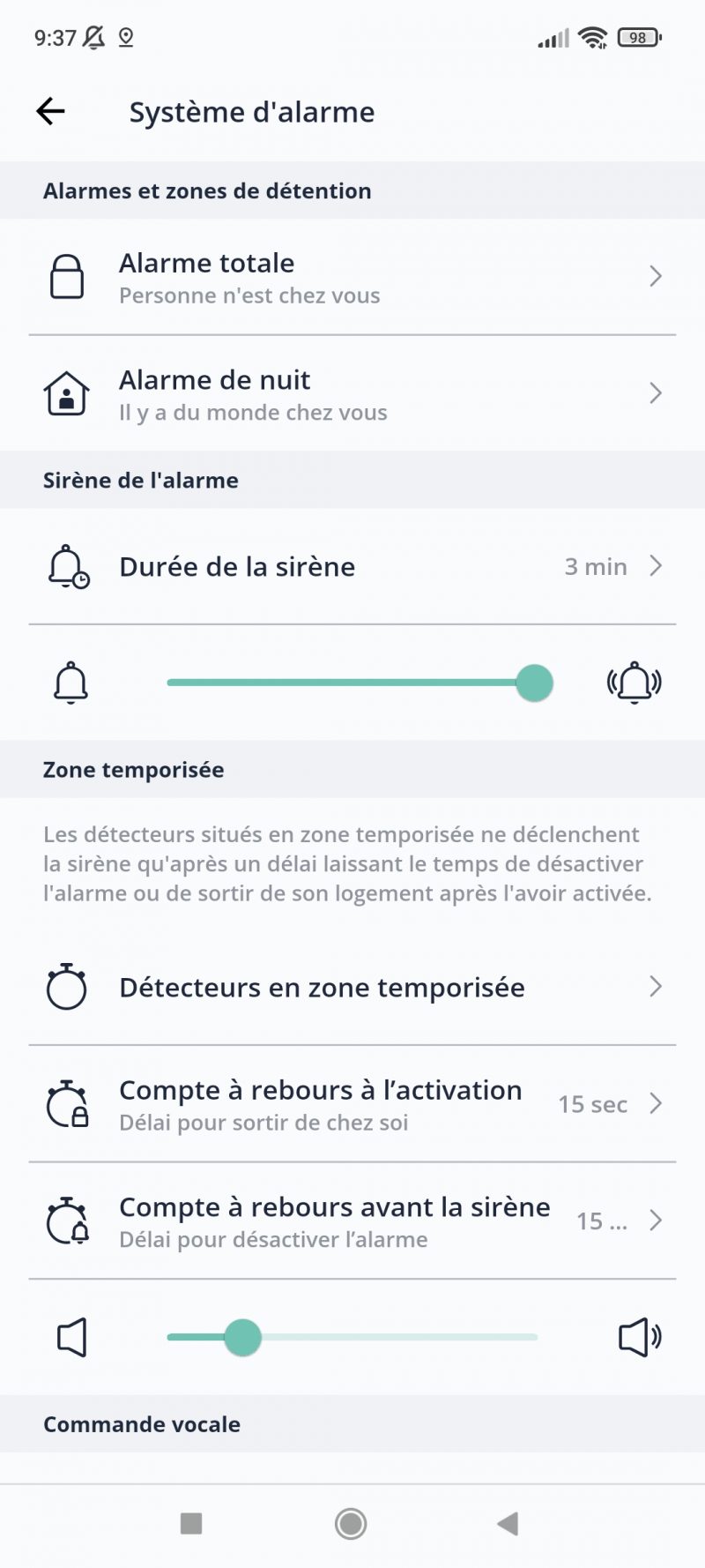 La section système d’alarme permet de gérer le fonctionnement de son système d’alarme, en indiquant notamment la durée et la puissance de la sirène, ou encore de délai d’activation au moment de sortir et le temps pour la désactivation avant le déclenchement de la sirène.