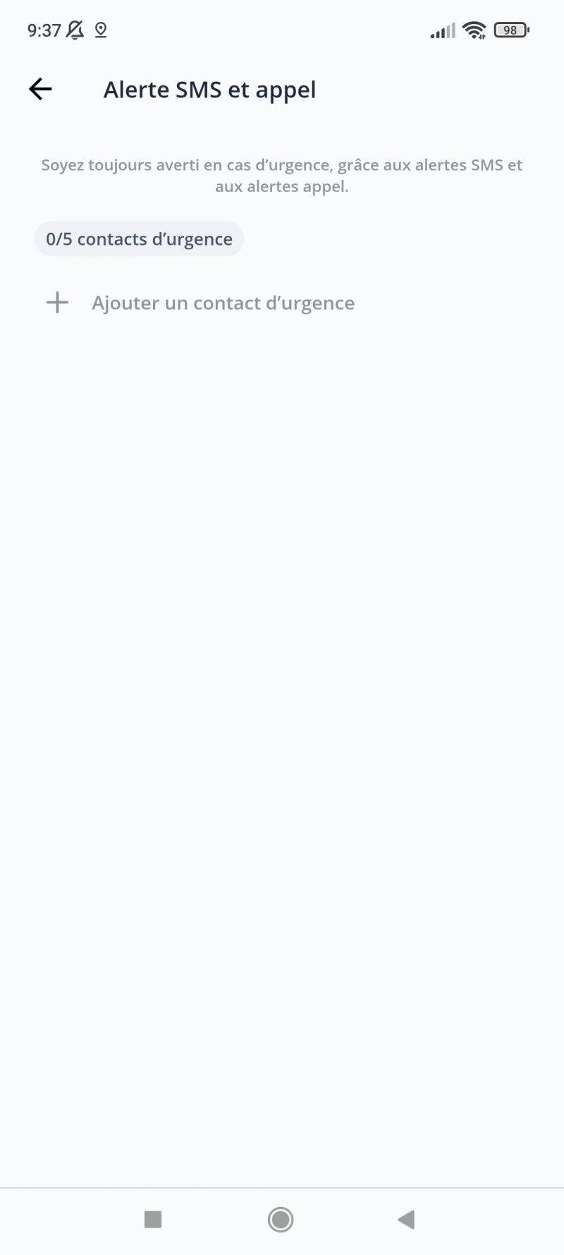 La section suivante permet de paramétrer les alertes en cas d’urgence. Jusqu’à cinq numéros peuvent être ajoutés, avec des alertes par appel, SMS ou les deux.